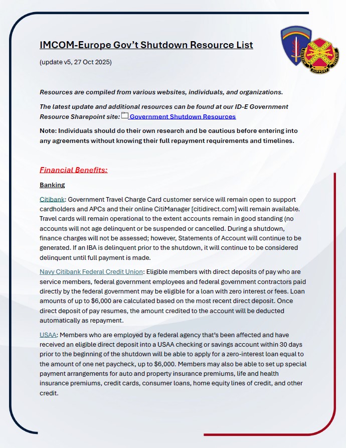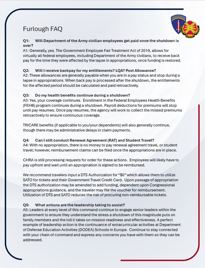 Gen. Donahue will conduct a town hall at 5 p.m. CET, Thursday, Oct. 30, 2025, to provide information on the continuing lapse of appropriations as it affects our Department of the Army civilian employees. Representatives from our G1, OJA, IMCOM-E, DODEA, and other garrison agencies will be on hand to answer questions (from both the virtual and in-person attendees).