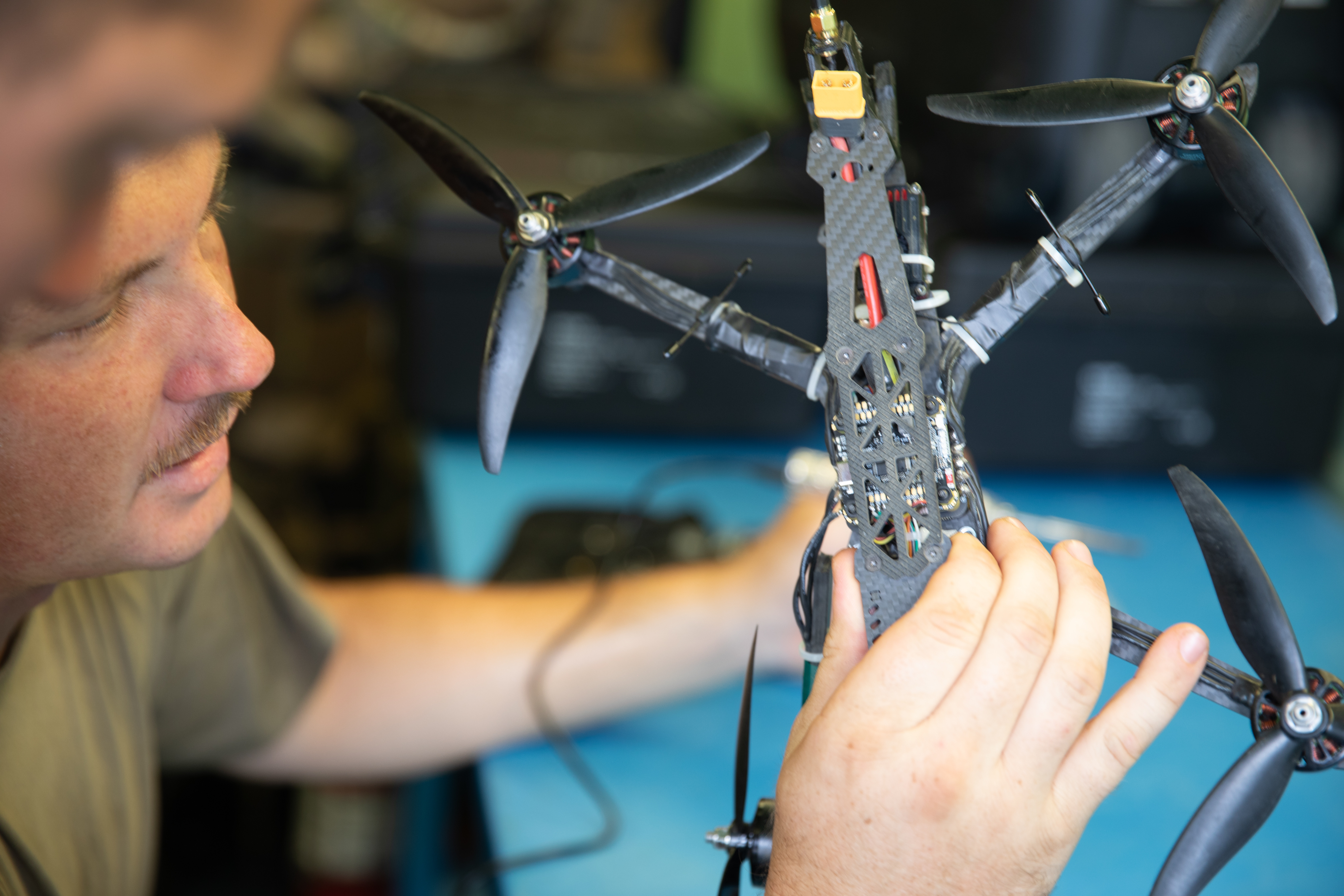 U.S. Army Sgt. Tucker Smith inspects wiring on a first-person view drone during field maintenance operations at Norio Training Area, Georgia, Aug. 2, 2025, as part of Agile Spirit 25. Both Soldiers are assigned to Hawkeye Platoon, Headquarters and Headquarters Troop, 1st Squadron, 91st Cavalry Regiment, 173rd Airborne Brigade. FPV drone maintenance is performed in forward environments using off-the-shelf components, 3D-printed parts, and on-site soldering to keep systems mission ready. (U.S. Army National Guard photo by Sgt. 1st Class Brittany Conley)