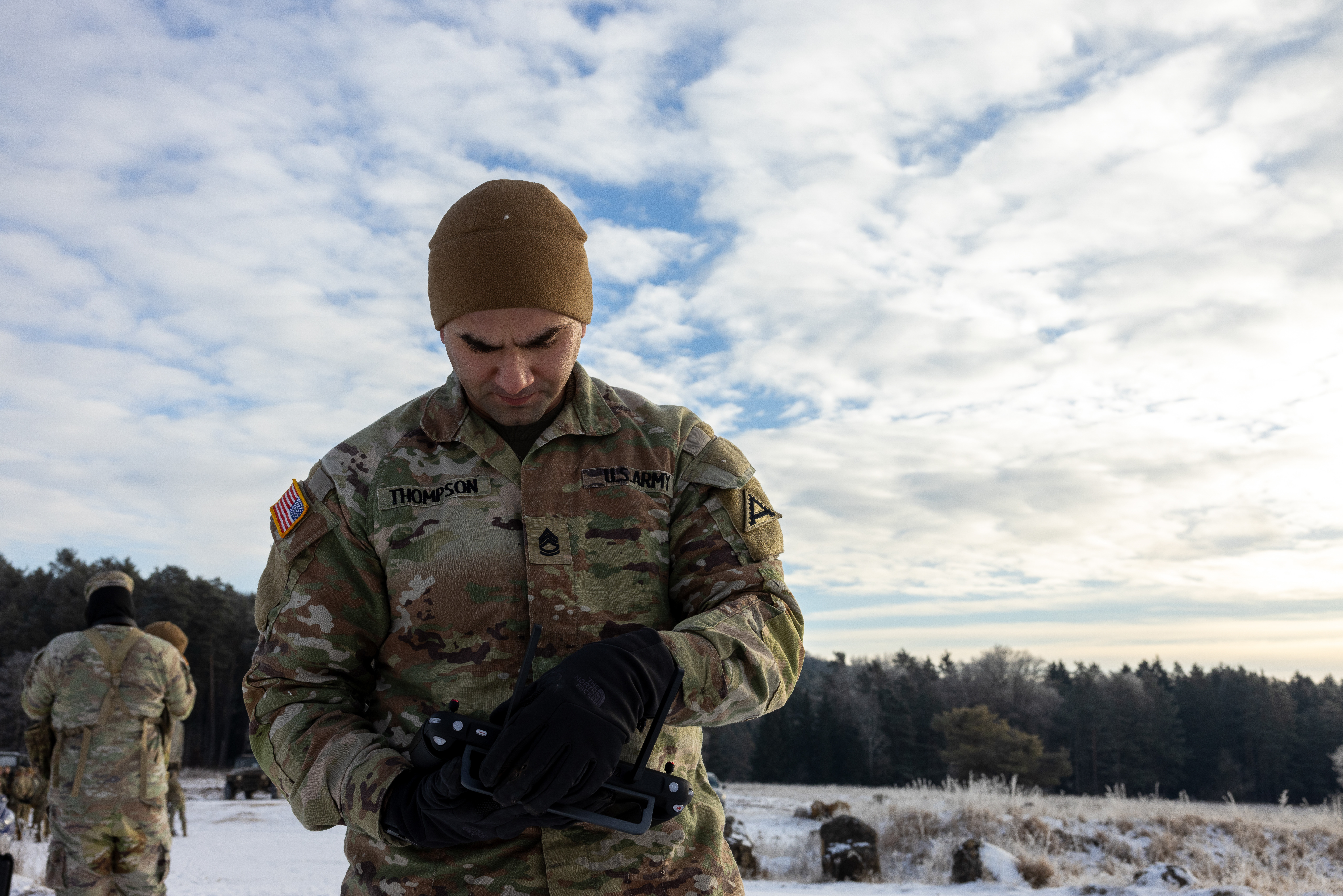 A U.S. Soldier assigned to the Joint Multinational Readiness Center as an observer, controller, and trainer (OC/T) operates a drone during an OC/T recertification course in the Hohenfels Training Area (HTA), Germany, Jan. 6, 2026. JMRC OC/Ts are the Army's warfighting advisors: their mission is to prepare Soldiers and leaders to accomplish missions for combatant commanders worldwide. The OC/T recertification ensures proficiency in monitoring unit operations, collecting data and providing timely feedback in the HTA. (U.S. Army photo by Pfc. Danil Pak)