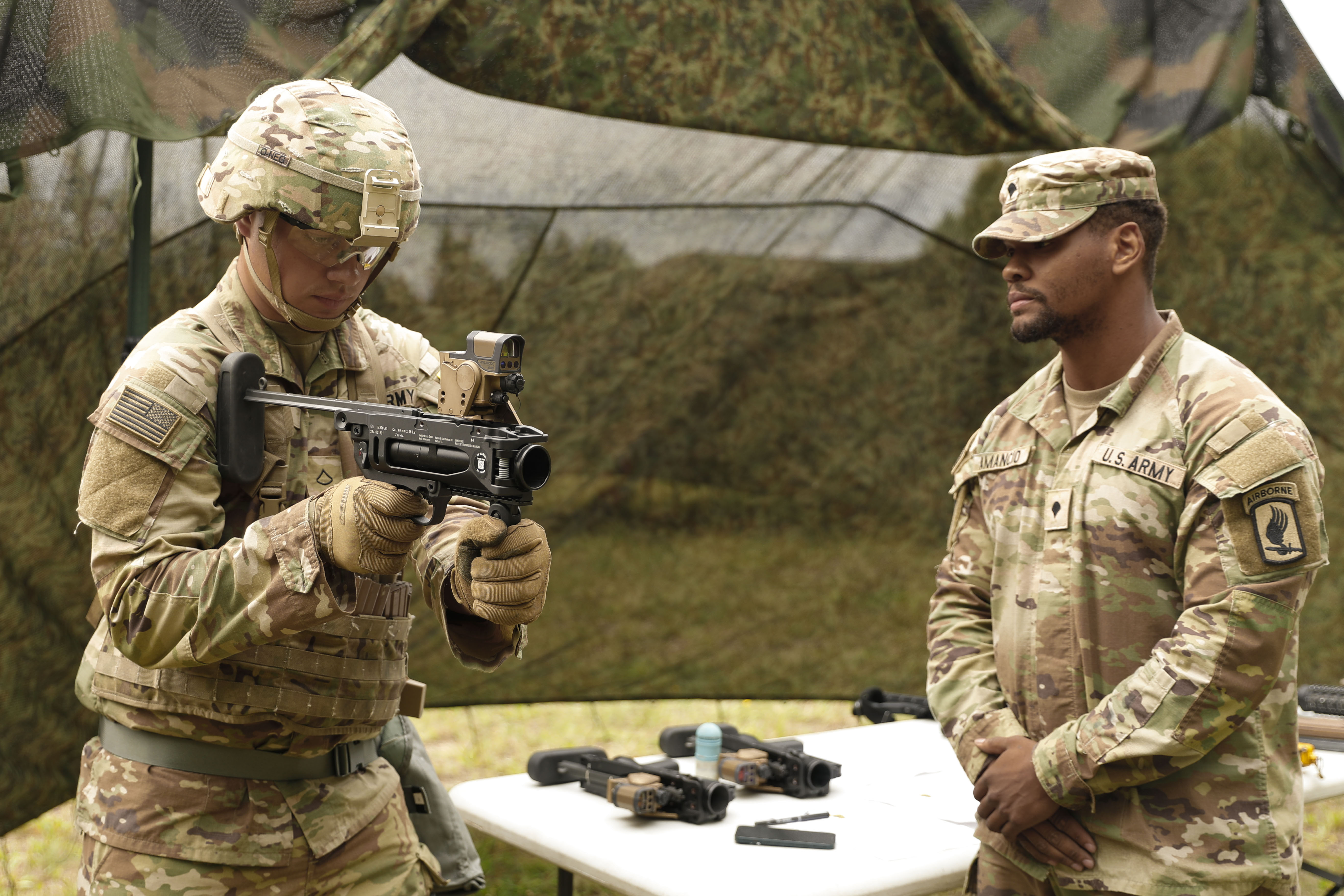 U.S. Army Pfc. Cannon Wall, assigned to 56th Theater Multi-Domain Command, conducts weapons familiarization with an M320 Grenade Launcher during day two of the U.S. Army Europe and Africa (USAREUR-AF) Best Squad Competition at Grafenwoehr Training Area, Germany, Aug. 21, 2025. Day two included Expert Infantry Badge/Expert Soldier Badge (E2B) training. E2B consists of various physical and mental tasks such as expert physical fitness assessment, day and night land navigation, day and night land navigation, weapons, medical and patrol procedures, and a 12-mile ruck march. Teams representing units from across USAREUR-AF will test their tactical proficiency, communication, and overall cohesion as they compete for the title of Best Squad. Winners of this competition will advance to compete at the U.S. Army Best Squad Competition.(U.S. Army photo by Spc. Josefina Garcia)