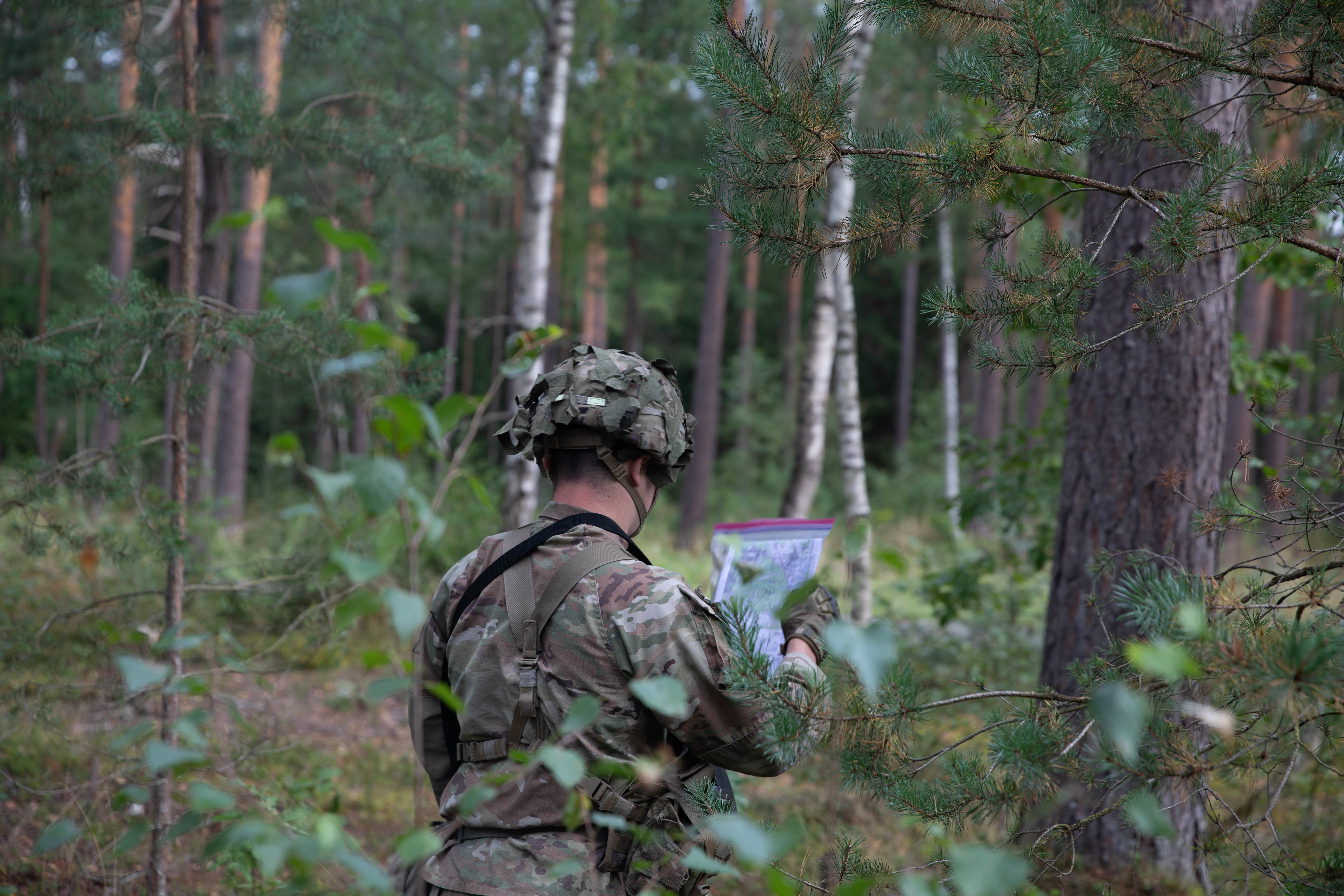A U.S. Soldiers, assigned to a subordinate command under U.S. Army Europe and Africa (USAREUR-AF), participates in the land navigation portion of the USAREUR-AF Best Squad Competition at Grafenwoehr Training Area, Germany, Aug. 22, 2025. Teams representing units from across USAREUR-AF will test their tactical proficiency, communication, and overall cohesion as they compete for the title of Best Squad. Winners of this competition will advance to compete at the U.S. Army Best Squad Competition. (U.S. Army photo by Sgt. Nathanial Johnson)