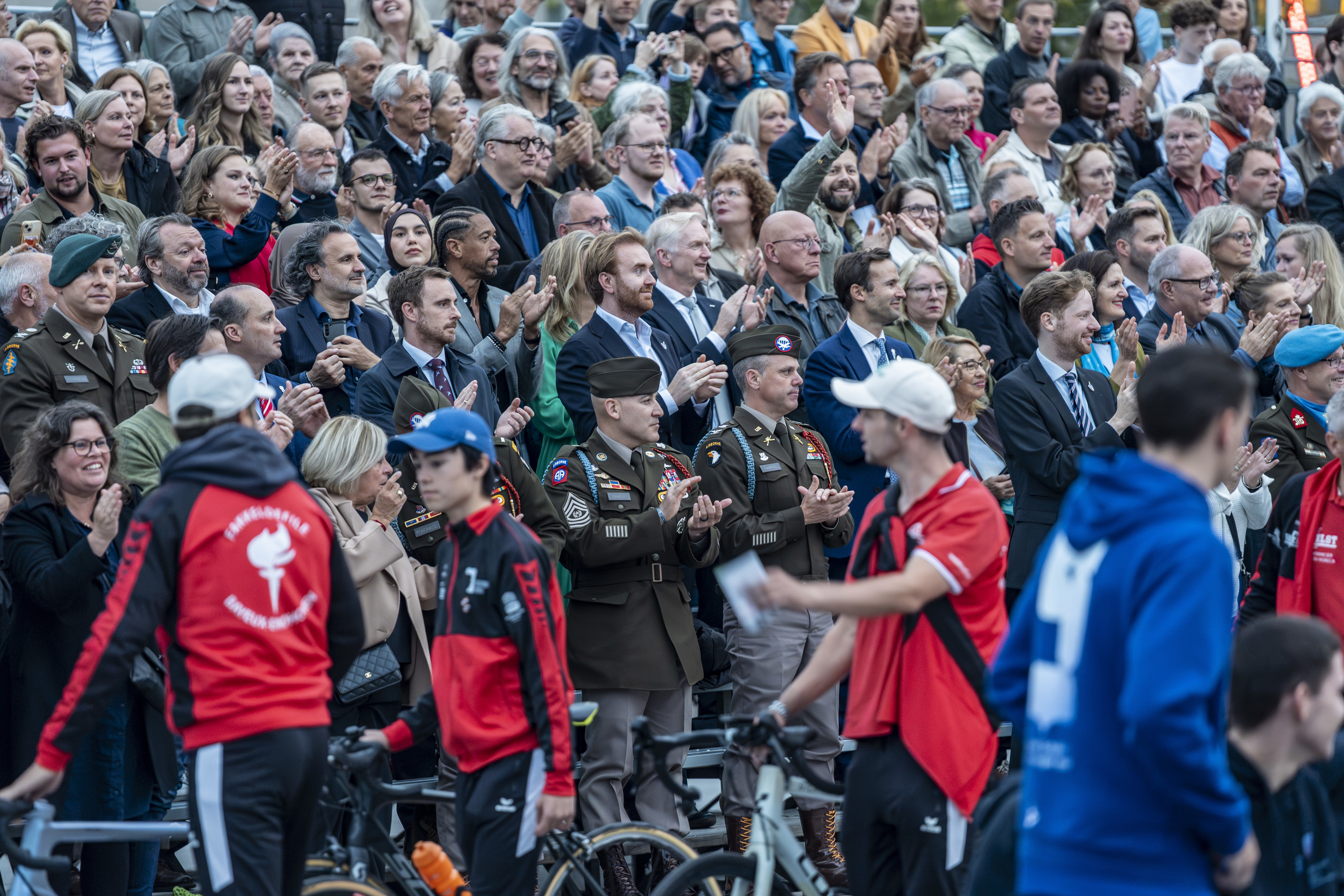 The audience applauds as the procession continues during the torchlight ceremony in Eindhoven, Sept. 18, 2025, commemorating the city’s liberation during Operation Market Garden 81 years ago. The annual event brings together veterans, reenactors, and citizens to honor the sacrifices of World War II and pass the memory on to new generations.